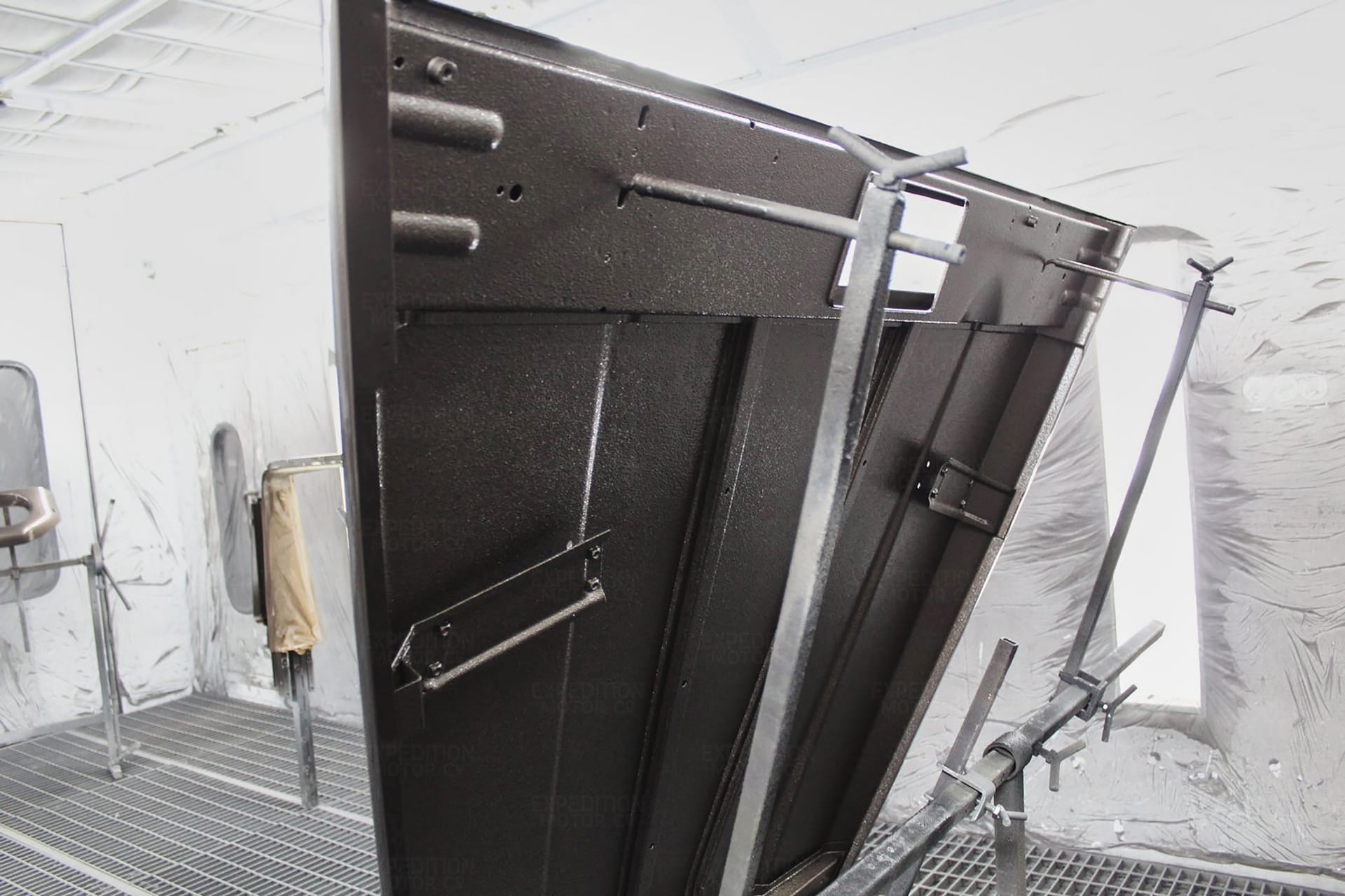 • Media blast frame to bare metal