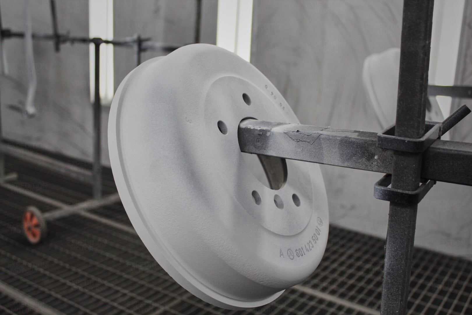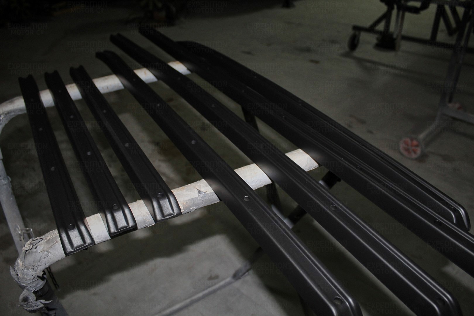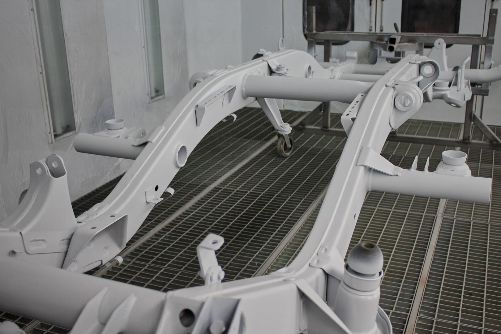• Media blast frame to bare metal